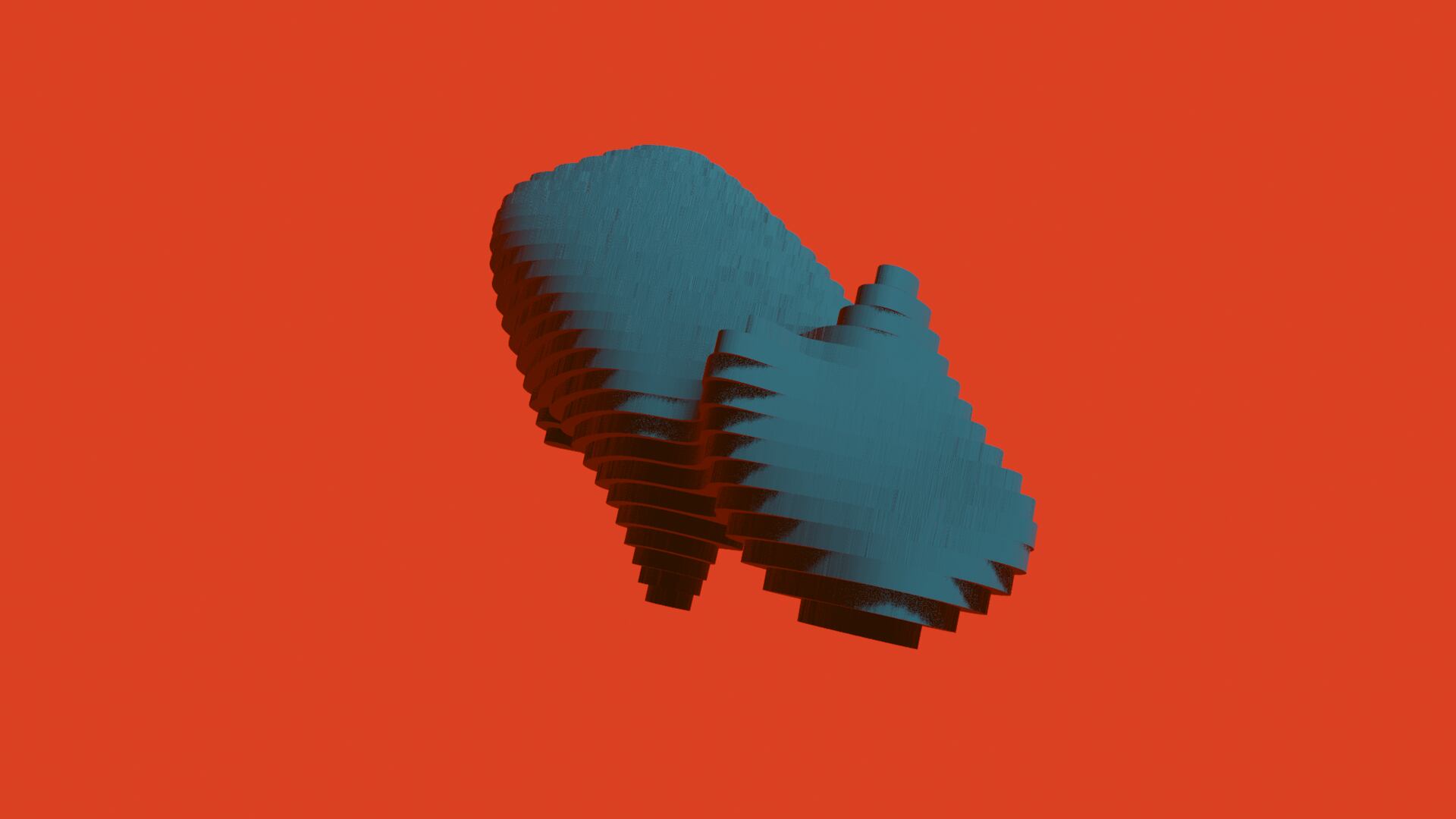 赤べこの3Dモデルに、プログラミングで等高線(Contour)のような層状のエフェクトをかけたオブジェです。斜め上方向に対して投稿線が引かれるように調整して制作しました。